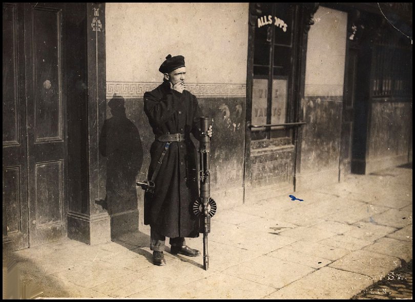 A Black and Tan on duty in Dublin. Smoking and posing with a Lewis machine gun. 11. Sackville Street ca. 1905