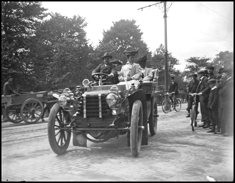 Man driving Panhard car, possibly a late 1901 or 1902 model, with three female passengers. 19. Waiting on Westland Row June 18, 1917.