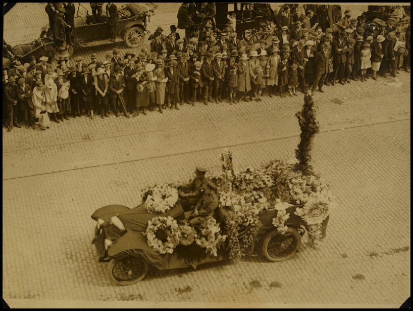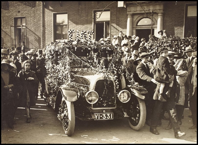 Fiat car adorned with flowers and surrounded by people at 18 Rutland Square (now Parnell Square), Dublin 8. View from top of Nelson’s Pillar, Sackville Street (O’Connell Street) ca. 1921