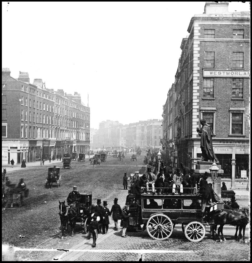 Lucania bicycles were manufactured by John O’Neill at the Lucania works in South King Street, Dublin. An advertisement for the Lucania in a 1911 edition of Sinn Féin carried the information also that the company had won a contract to supply the Post Office with 400 delivery bicycles. 6. Horse-drawn Omnibus, Westmoreland Street, Dublin ca. 1865