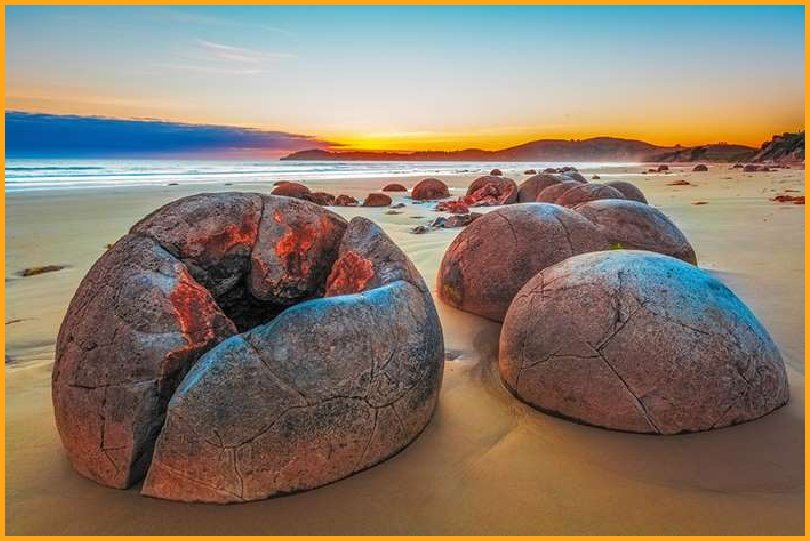 If you go to see this lake, located in British Columbia’s Okanagan Valley, in the spring or winter, you won’t be able to see how it’s different than other lakes. In the summer, however, as it gets hot and the water starts to evaporate, the lake turns into many tiny colorful pools of water with high concentration of different minerals. Moeraki Boulders, New Zealand