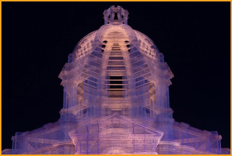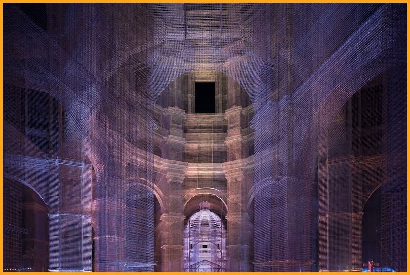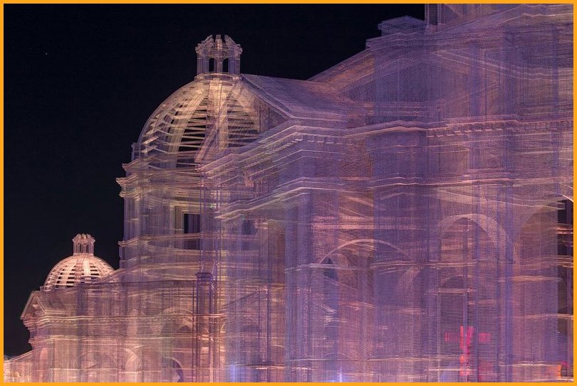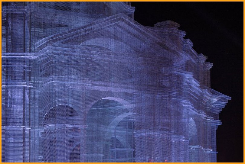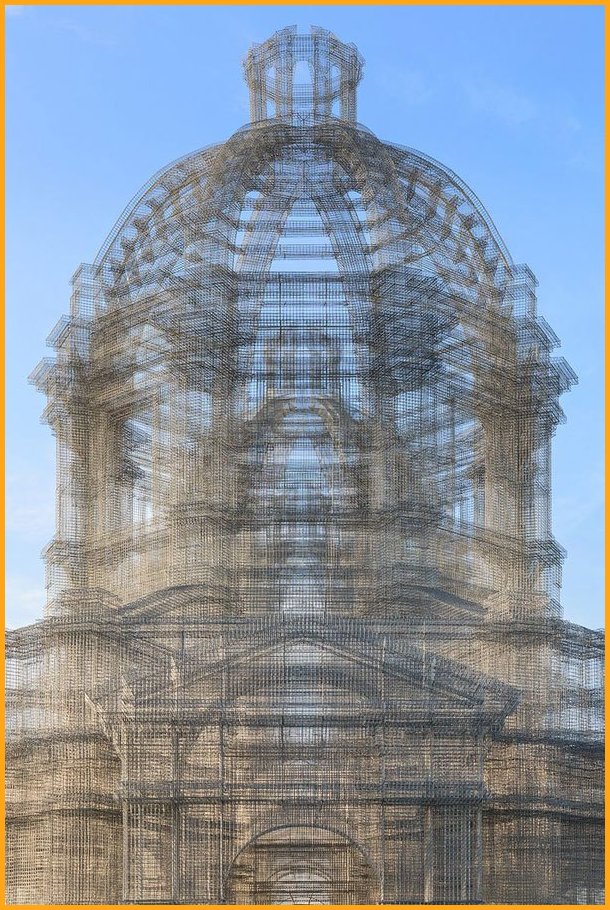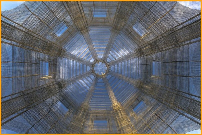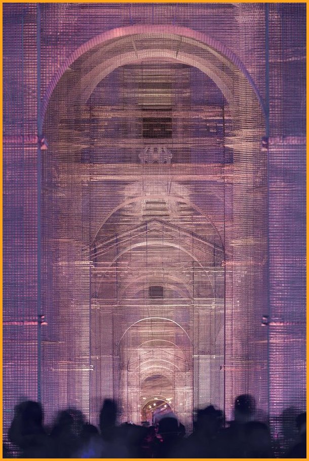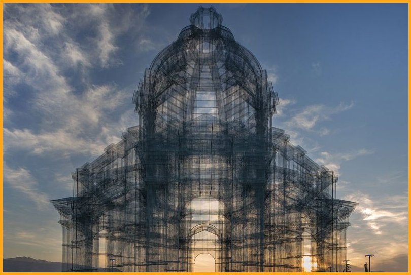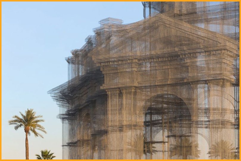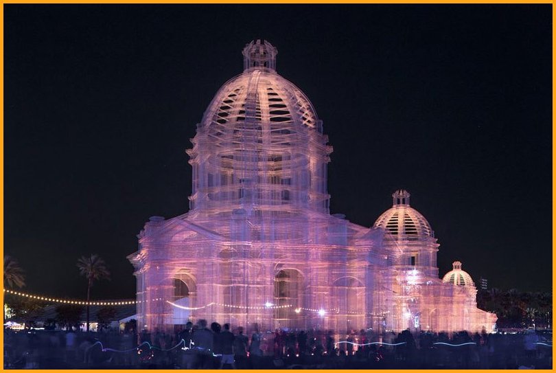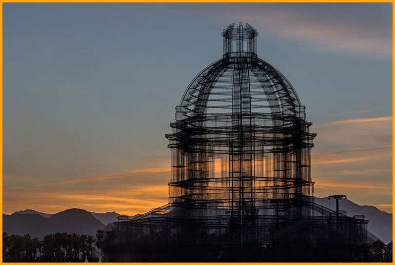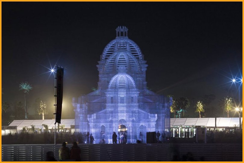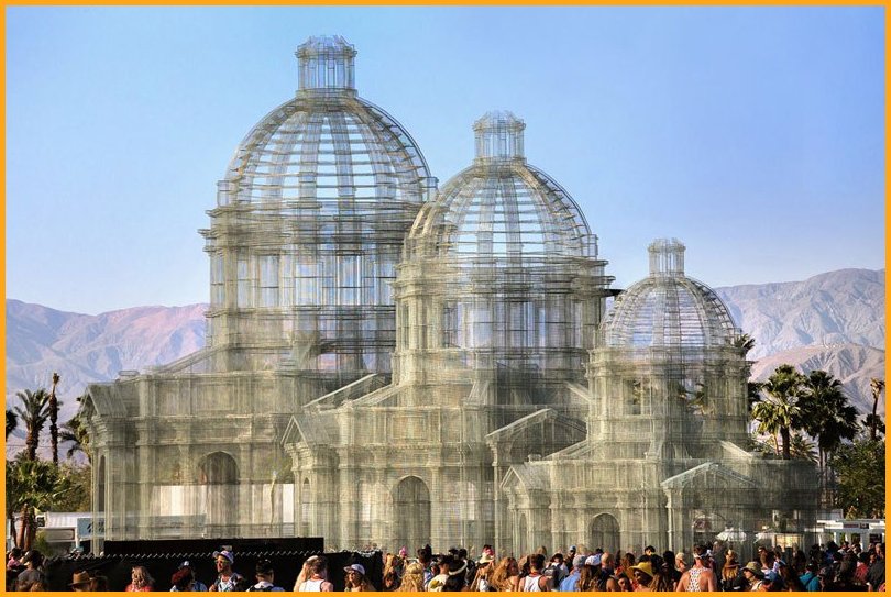 “Etherea” is the site-specific installation by Edoardo Tresoldi conceived for the Coachella Valley Music and Arts Festival in Indio, California. The installation consists of three transparent sculptures inspired by Neoclassical and Baroque architecture, all with identical shapes but different sizes, positioned on an axis and measuring 36, 54 and 72 feet in height, respectively. “Etherea” follows a growing experiential path where architecture becomes a tool and place for contemplation, a dedicated space where the sky and clouds are narrated through the language of classical architecture. Thanks to the transparent wire mesh, an optical effect made of perspectives and dimensional relationships is generated by the passage through the three sculptures and measuring scales, which either amplifies or reduces the distance between man and sky.